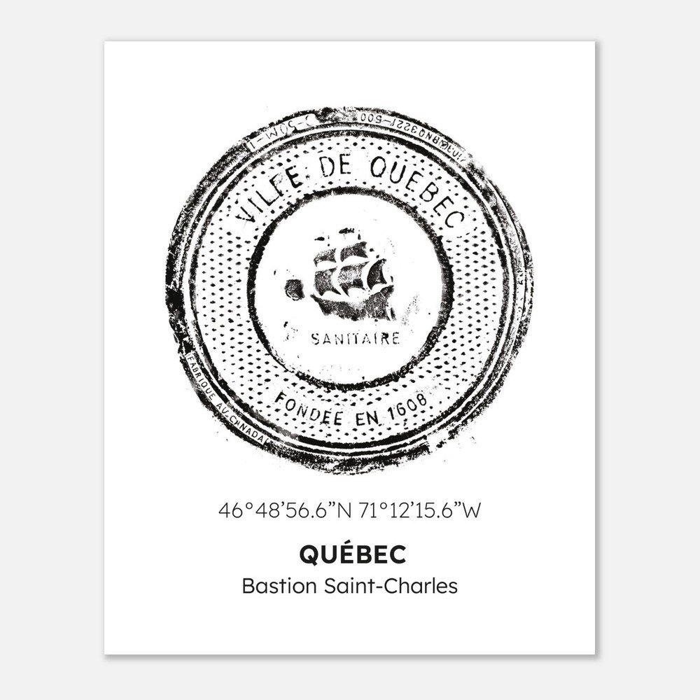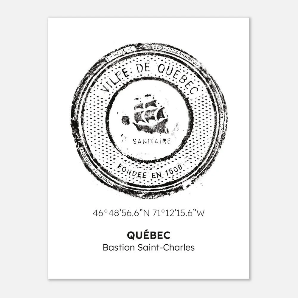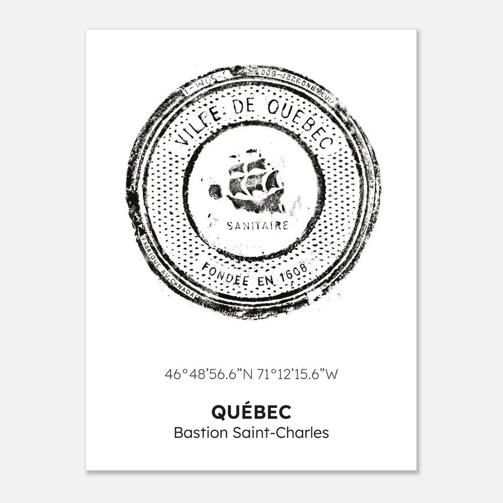Empreintes Urbaines — QuébecCette affiche présente l’empreinte originale d’une plaque d’égout de la Ville de Québec, capturée directement dans l’espace public. Marquée des inscriptions Ville de Québec et de ses coordonnées géographiques, elle témoigne de l’histoire, du territoire et du caractère unique de la capitale.L’empreinte a été numérisée à partir d’un scan haute résolution, puis imprimée fidèlement afin de conserver la texture brute et les détails du relief original. Cette impression numérique transforme un élément fonctionnel du paysage urbain en œuvre d’art contemporain mural, à la fois graphique, minimaliste et chargée de sens.Formats disponibles : 8 × 10, 11 × 14 ou 18 × 24Papier : Mat, lisse, non réfléchissant — 200 gsmPapier durable : Certifié FSC ou équivalent